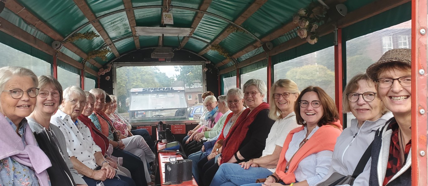 Die KFD St. Catharina Dinklage erlebte kürzlich eine fröhliche Planwagenfahrt, die die Teilnehmerinnen von Dinklage nach Badbergen führte. Der Ausflug begann pünktlich um 13:30 Uhr bei der BGST, begleitet von einem gut gelaunten Treckerfahrer und ebenfalls gut gelaunten Frauen. Die Reise führte durch die idyllische Landschaft bis nach Badbergen, wobei die Teilnehmerinnen auf den teils holprigen Wegen ordentlich durchgeschüttelt wurden – die Stimmung blieb aber hervorragend. Während der Fahrt sorgte Anke Homrighausen mit Gitarre und den mitgebrachten Gesangbüchern für musikalische Unterhaltung – von Volksliedern, passend zu Fahrt wurde „ Hoch auf dem gelben Wagen“ geschmettert, über Schlager bis hin zu „Du hast den Farbfilm vergessen“ von Nina Hagen.