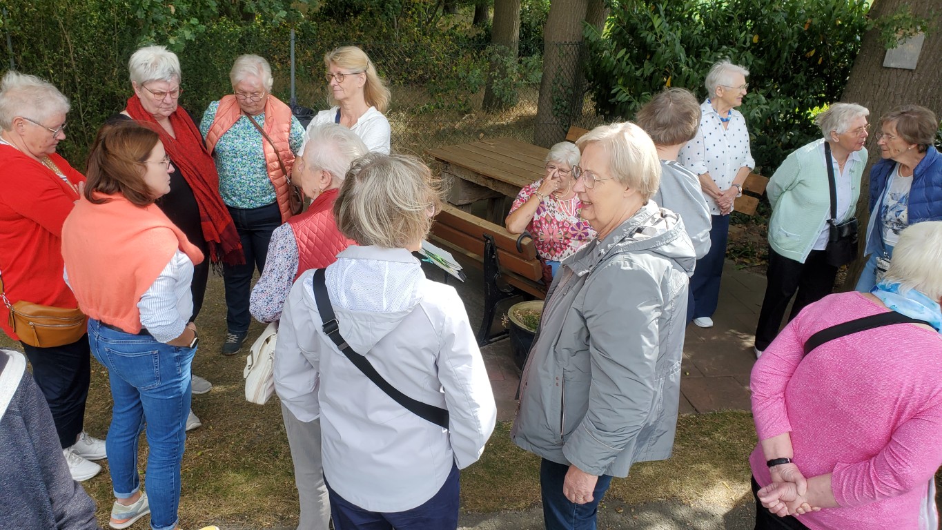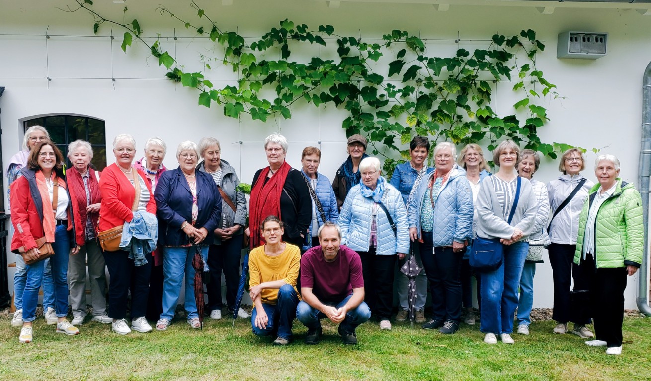 In Badbergen angekommen, stand die Besichtigung des Gartens von Familie Elsner am alten Wasserwerk auf dem Programm. Nach einer leckeren Kaffeetafel führte eine umfangreiche Gartenführung durch die verschiedenen Gartenräume: Waldgarten, Park, Kirschgarten mit Ahornhain, Rosengarten, Gräsergarten und Obstwiese. Der Garten, der auch schon im NDR in der „Landpartie Artland“ vorgestellt wurde, beeindruckte die Teilnehmerinnen mit seiner Vielfalt und Schönheit.